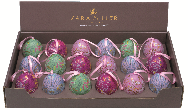 Mini påskeegg i metall (delbare) i display a 36 stk., 4 assorterte motiv fra Sara Miller, London.
