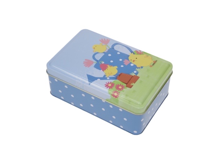 Rektangulær metallboks med påskemotiv og hengslet lokk.