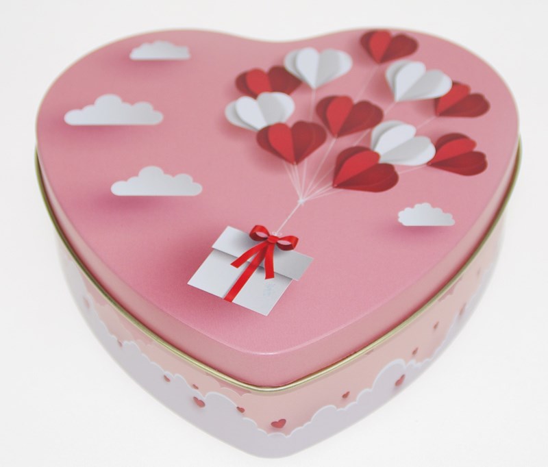"Amour" Hjerteformet metallboks med gave og hjerte motiv. Fin til oppbevaring av sjokolade etc.