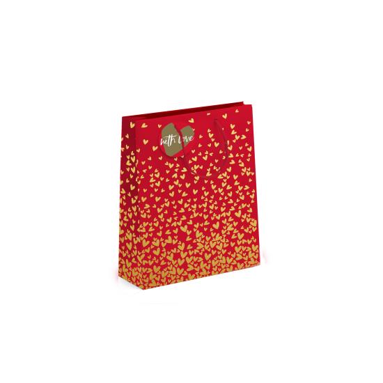 Gavepose parfyme i kraftig papir med gullfolierte hjerter, pakkelapp og solid snor. Perfekt til Valentine.