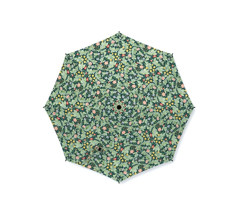 Kompakt og lett paraply i "Leicester Wallpaper" design, produsert av Museums & Galleries, England. Designet er laget av J.H. Dearle (1859-1932), England, 1912. Kommer med matchende trekk med glidelås