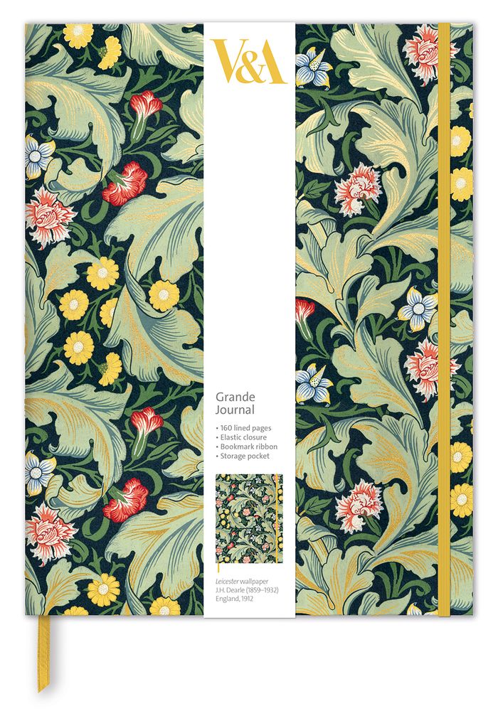 Stor innbundet skrivebok med linjer fra Museums & Galleries med design "Leicester Wallpaper" av J.H. Dearle (1859-1932), England, 1912. Med gullsnitt, gullfolierte detaljer på omslaget, innvendig lomme og strikk-lukking. Boken er trykket på FSC Mix Paper C 007972.
