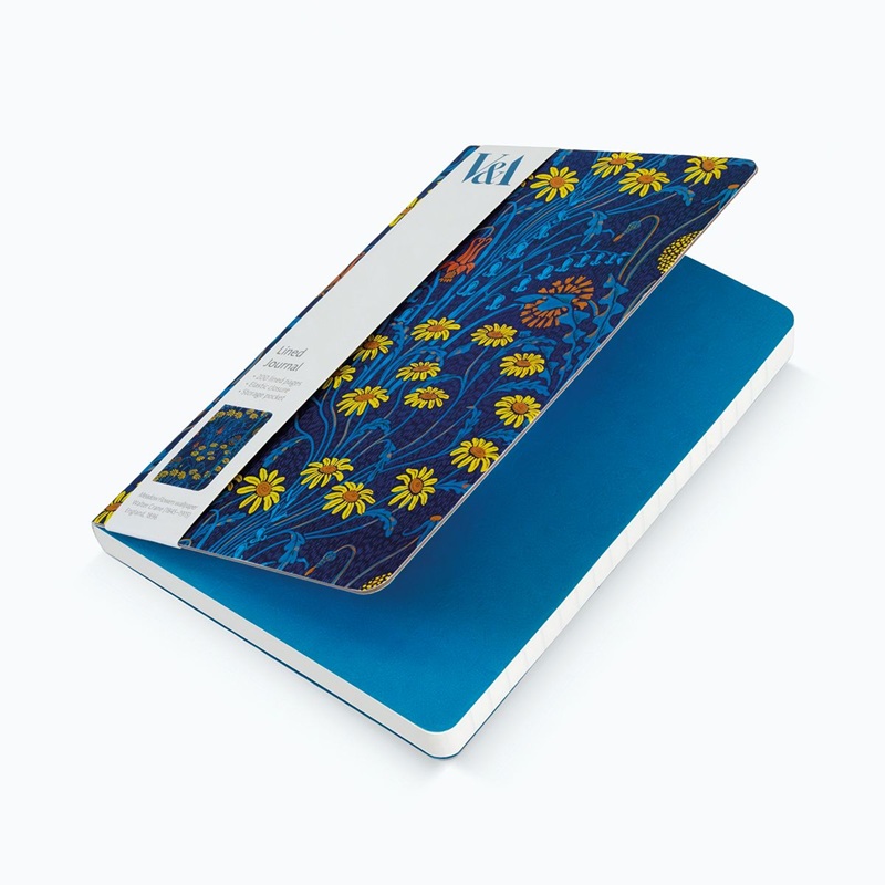 Linjert skrivebok med strikklukking og lomme for oppbevaring på innsiden av permen. Produsert på FSC Mix Paper C007972 av Museums & Galleries, England. Designet "Meadow Flowers" er hentet fra en tapet designet i 1896 av Walter Crane (1845-1915).
