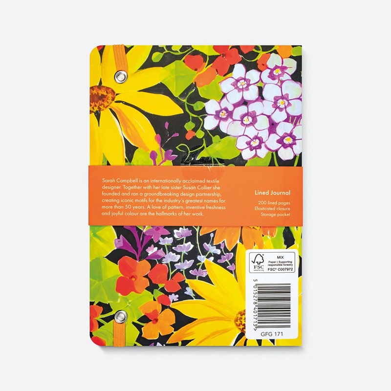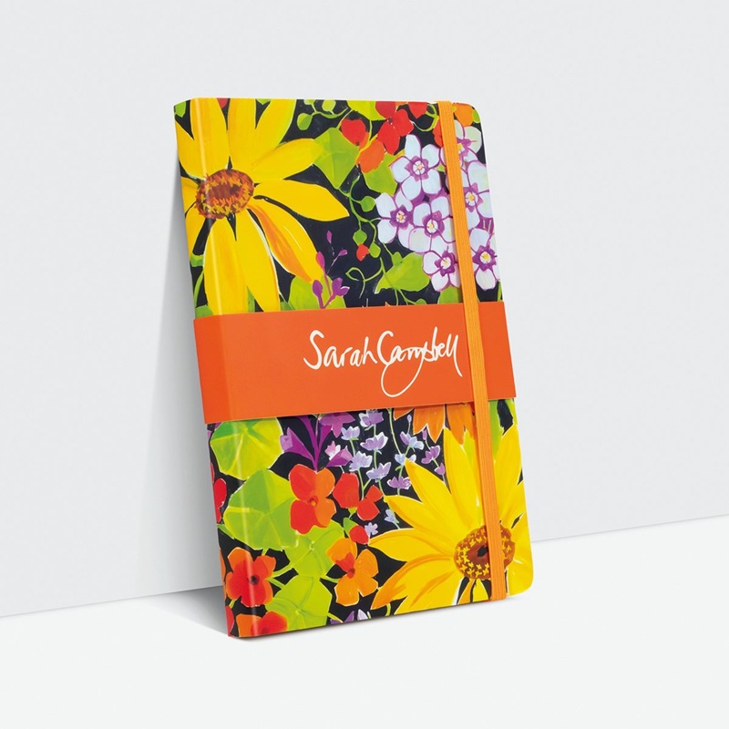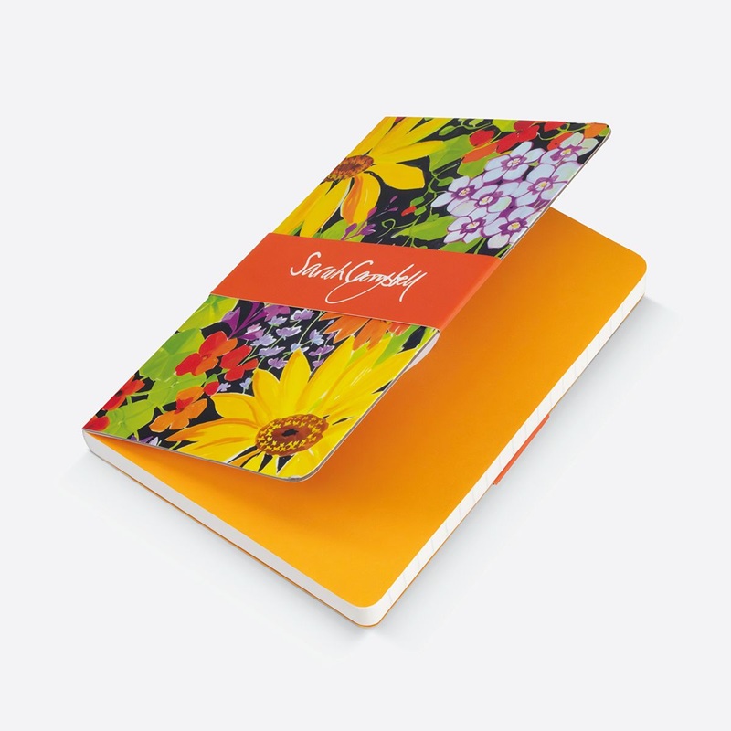 Linjert skrivebok med strikklukking og lomme for oppbevaring på innsiden av permen. Produsert på FSC Mix Paper C007972 av Museums & Galleries, England. Motivet er "Sunflowers" som er fra et original gouache-maleri på papir av Sarah Cambell, 2012.
