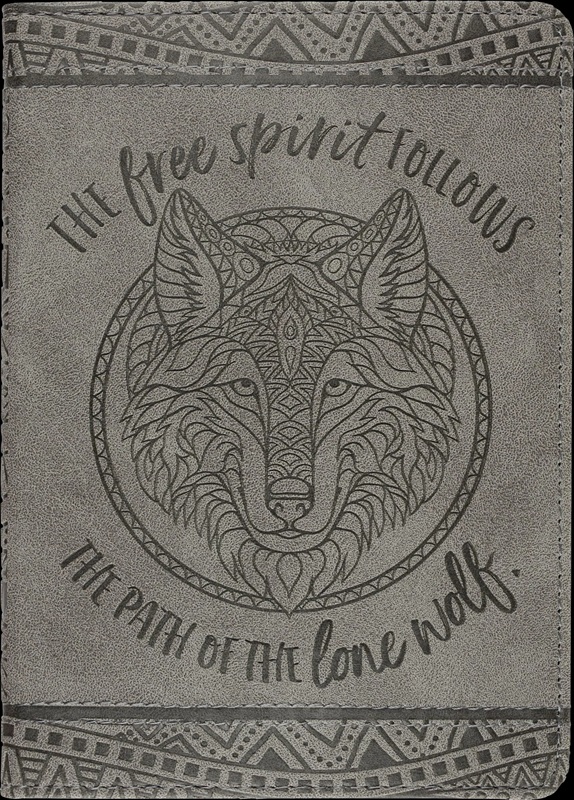 Innbundet Artisan Journal (skrivebok) med linjerte sider, preget innbinding, strikk-lukking og innvendig lomme. Tekst på forsiden "The free spirit follows the path of the lone wolf"