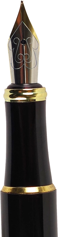 Eksklusiv fyllepenn i solid messing konstruksjon med nydelig lakk finish, gullforgylt pennesplitt for jevn skrift (0,5 line), sort blekk (normalpatron) og blekkpumpe for bruk av blekkhus. Fyllepennen ligger i en gaveeske med gullfolierte detaljer.